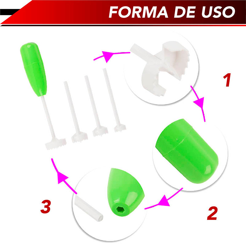 La mejor característica de este descorazonador vege drill son los cuatro cabezales intercambiables que te dan el tamaño justo para varias frutas y verduras. Funciona en calabazas, chiles, manzanas, cebollas y más. Rápido de armar y listo para usar sin causar daño en tus verduras o frutas.