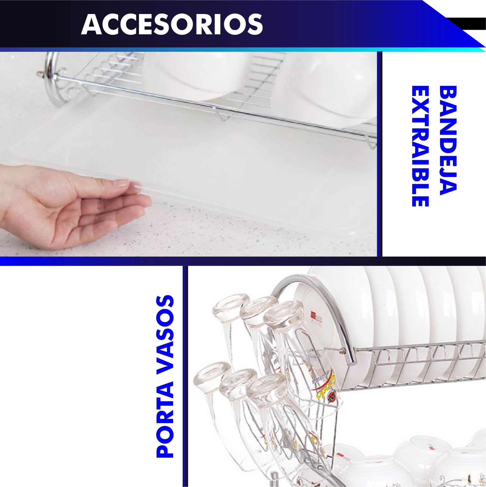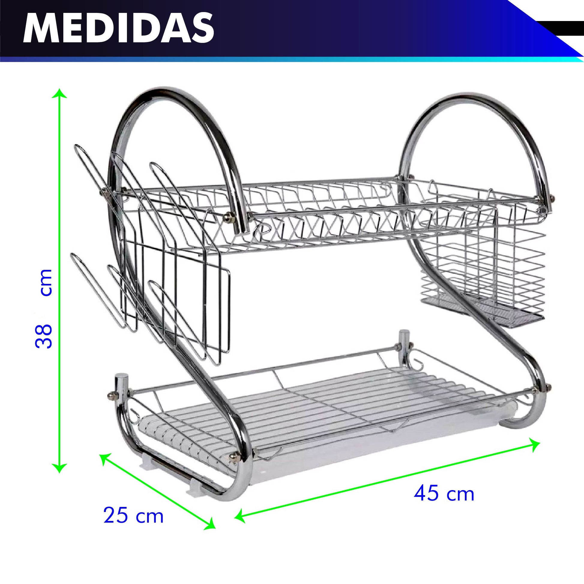 - Contenido: Escurridor 18", compartimientos de vasos y cubiertos, además de una charola de plástico.