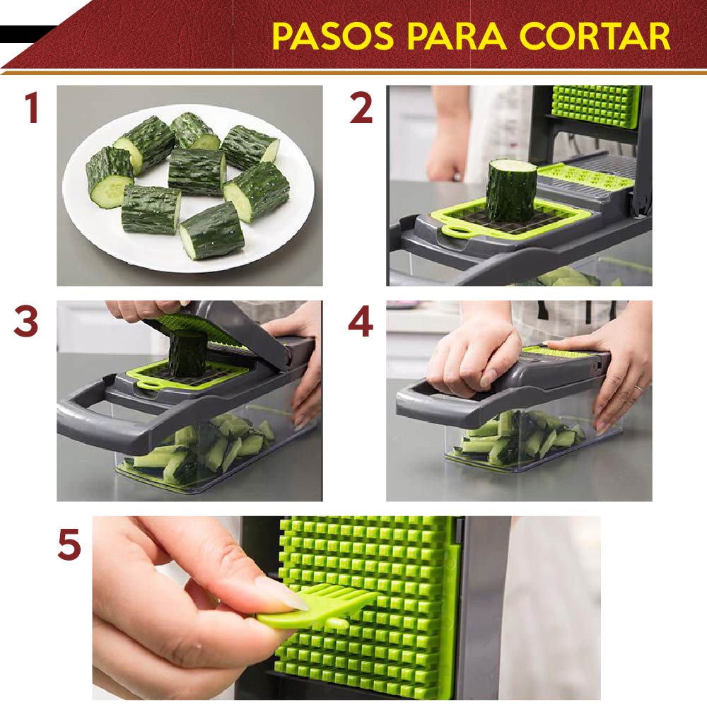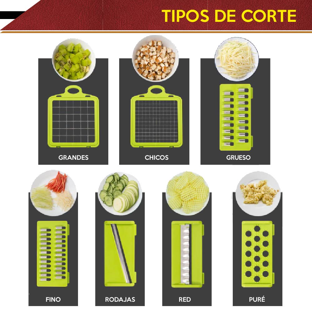- Lograr más de 20 tipos de corte: Cortes medianos y grandes, cubos, palos, cuartos, julianas, espirales perfectas, julietas y rebanadas. Incluye cuchillas diferentes para realizar cada tipo de corte