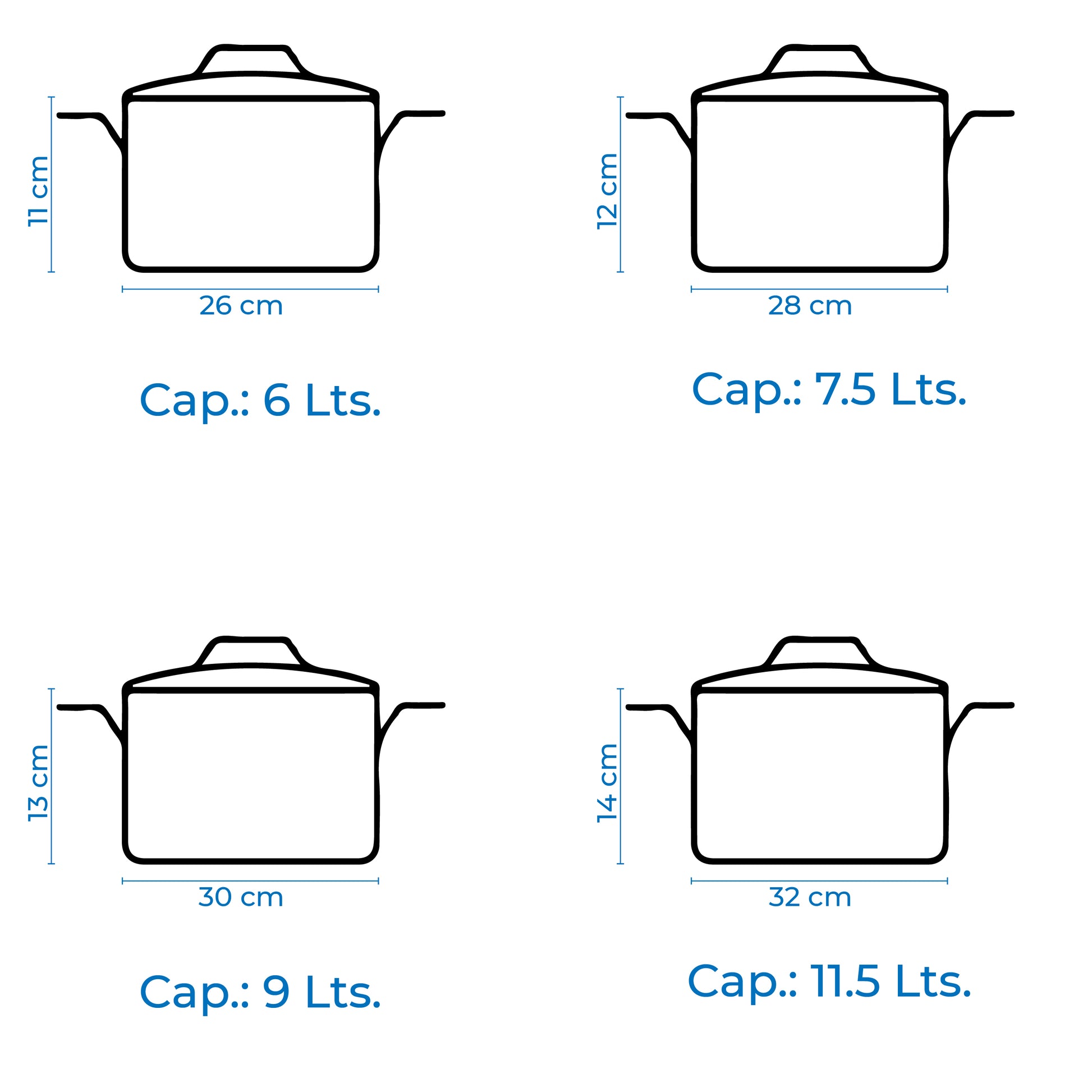 * *🥘 SET PROFESIONAL DE GRAN CAPACIDAD:* El kit incluye 4 ollas de dimensiones superiores diseñadas para grandes volúmenes: *26cm (6L), 28cm (7.5L), 30cm (9L) y 32cm (11.5L)*. La variedad de tamaños ideal para familias numerosas, caldos, pozole o banquetes.