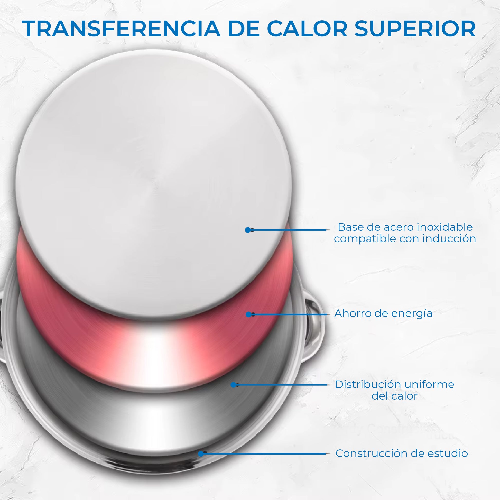 Ya sea que cocine en una moderna estufa de *Inducción* o en una tradicional de *Gas*, este juego de ollas responde con la misma eficiencia. Su fondo difusor elimina los puntos calientes, asegurando que sus alimentos se cocinen de manera uniforme y rápida.