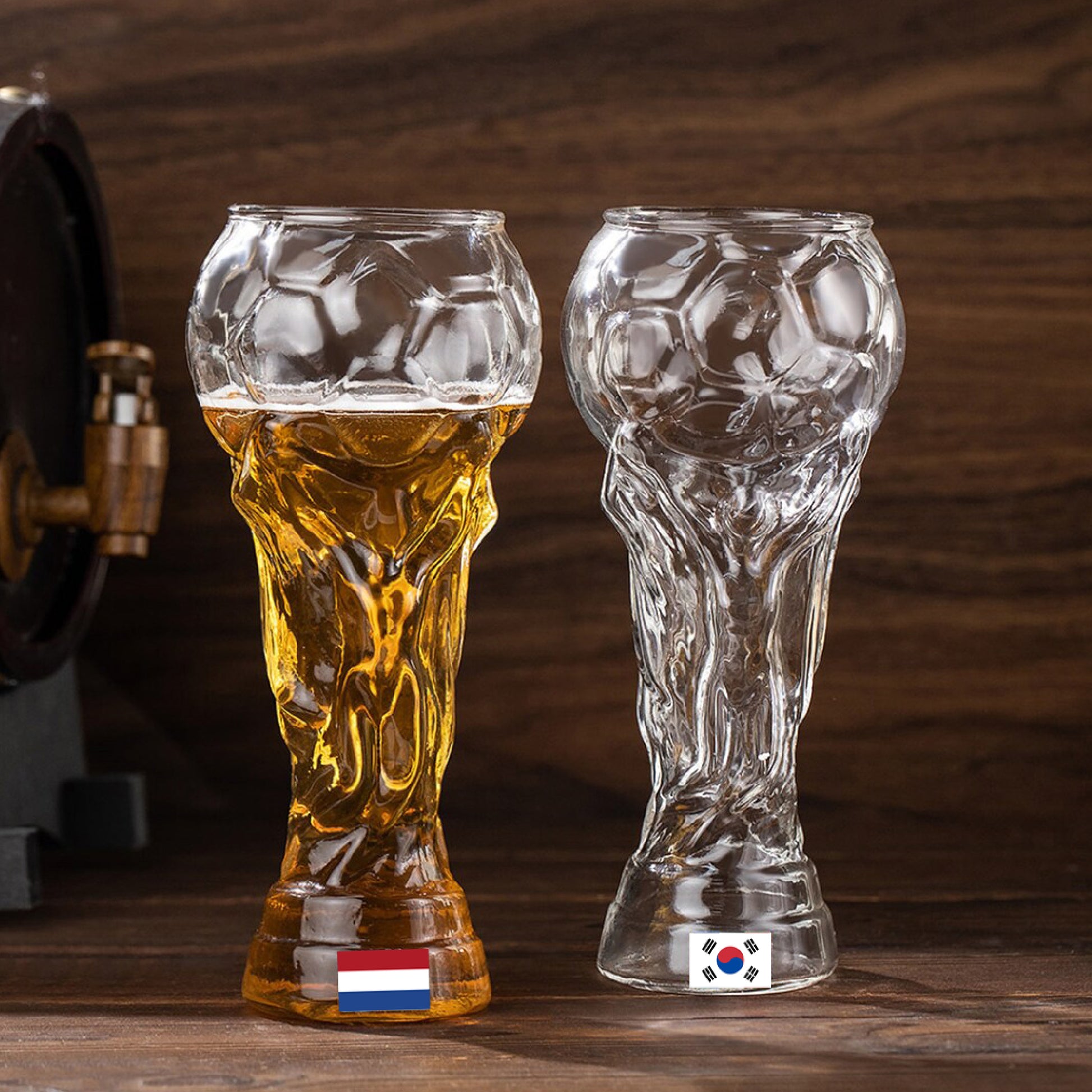 Cada vaso de *450 ml* ha sido moldeado con precisión para replicar la silueta del trofeo original. Su diseño transparente permite apreciar el color y la espuma de tu cerveza, haciendo que cada brindis se sienta como levantar la copa en la final.
