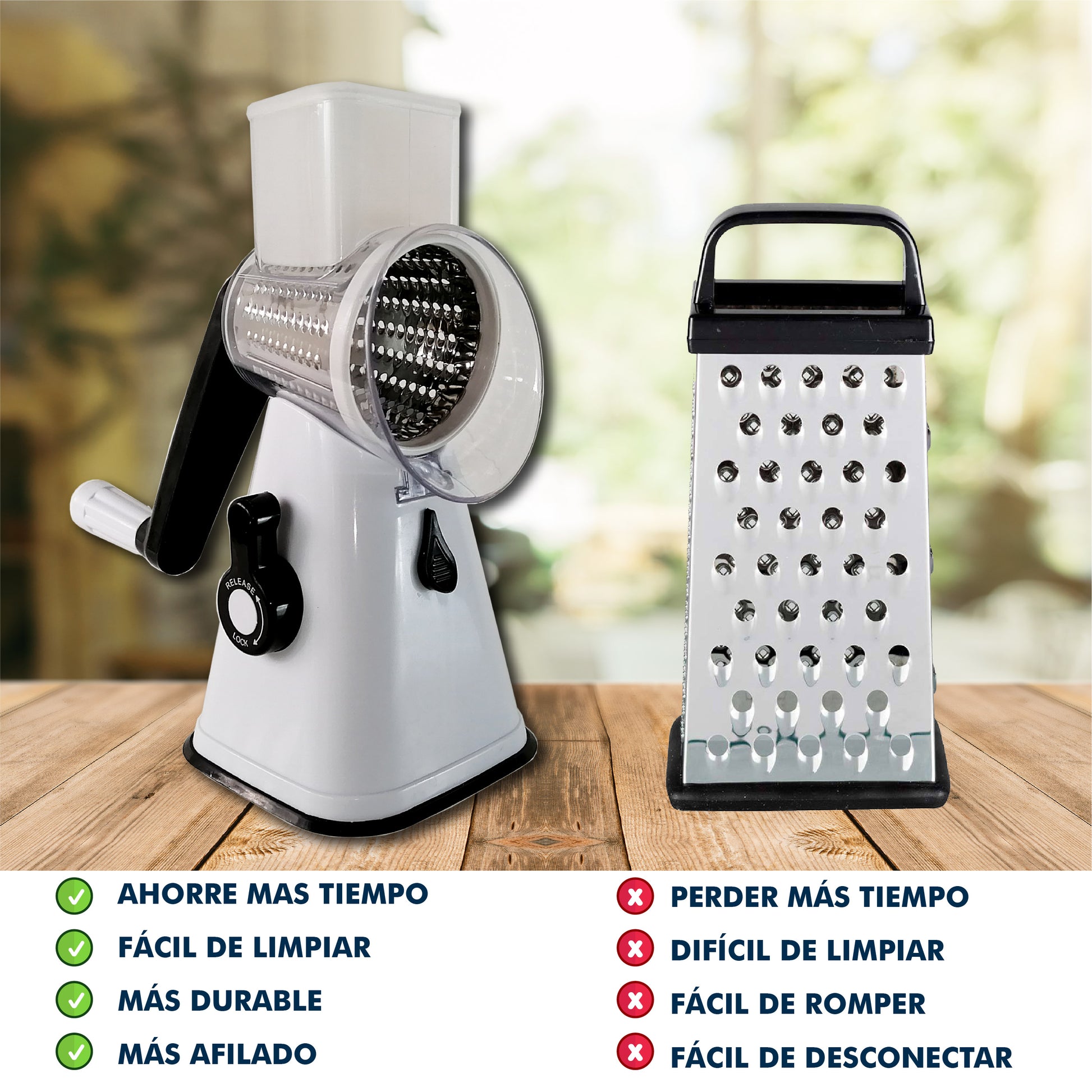 • Este cortador de verduras para ahorrar tiempo viene con tres tambores de acero inoxidable: uno para rebanar, uno para cortar y otro para rallar. Cada tambor cuenta con una cuchilla súper afilada. Un solo giro de la manija crea cebollas perfectamente cortadas, repollo rallado, calabacines finamente cortados. ¡y mucho más!